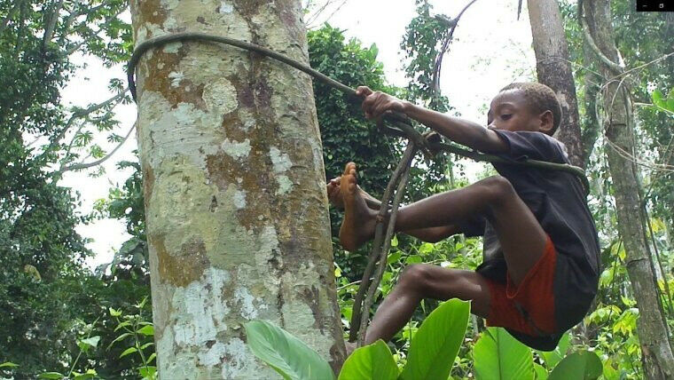Ein BaYaka-Junge klettert für die Nahrungssuche auf einen Baum Foto: Karline Janmaat