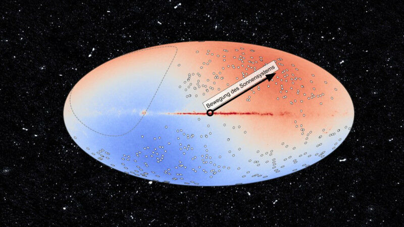Eine Möglichkeit, die größte Strukturen des Universums zu vermessen, ist es, mit Radioteleskopen das Licht ferner Galaxien zu beobachten. Die hellsten Galaxien senden meist auch starkes Radiolicht aus und sind daher besonders gut geeignet, um weit in den von uns aus einsehbaren Teil des Alls zu blicken dort die Verteilung der Galaxien zu vermessen. Bei diesen Messungen muss aber ein Schlüsseleffekt berücksichtigt werden, der die Daten verfälscht: Der Radiodipol. Dabei handelt es sich um einen kosmologischen Effekt, der durch die Eigenbewegung der Erde und des Sonnensystems durch unsere eigene Galaxie entsteht. In Bewegungsrichtung erscheinen Galaxien als Radiolichtquellen heller als in entgegengesetzter Richtung. Das führt dazu, dass Forschende in dieser Richtung mehr Galaxien finden, als in der entgegengesetzten Richtung. Denn jedes Teleskop hat eine begrenzte Empfindlichkeit, und je weiter eine Lichtquelle entfernt ist, desto schwächer erscheint sie und desto mehr entzieht sie sich dem Blick eines Teleskops