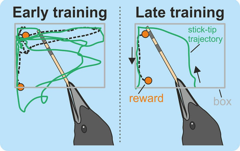 For the study, the researchers first trained three carrion crows to pick up a stick in their beak. In the next step, the crows learned by trial and error to retrieve food pellets from a transparent Plexiglas box using a stick; they could not reach the pellets with their beak alone. Also, if the pellet was guided out too quickly, it could fall off the setup table, out of reach of the bird. The birds’ training sessions were documented by recording the movements of the tip of the stick. "The crows first picked the stick from a holder and adjusted it until they were grasping the stick such that it was precisely aligned with their beak, then they used it to guide the pellet within reach. During pellet manipulation, they closely observed how the stick-tip affected the pellet to correct any mistakes immediately," said Moll , explaining the actions of the trained carrion crows. They only ate the food once they had returned the stick to the holder.