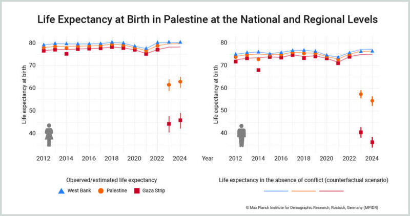 A research team from the Max Planck Institute for Demographic Research (MPIDR) and the Centre for Demographic Studies (CED) investigated the impact of the conflict in Gaza on mortality. They estimate that 78,318 (70,614-87,504) people were killed in Gaza between October 7, 2023 and December 31, 2024. As a result, life expectancy in Gaza in 2024 fell to nearly half the level expected without the war. An update of their analysis, produced after the publication of the study, revealed that the current violent death toll likely exceeds 100,000.