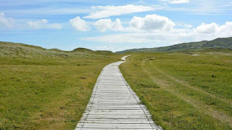 A plank path leads across a large meadow without a destination. Symbolic image for the 404 page. Image: Pixabay, KlausHausmann