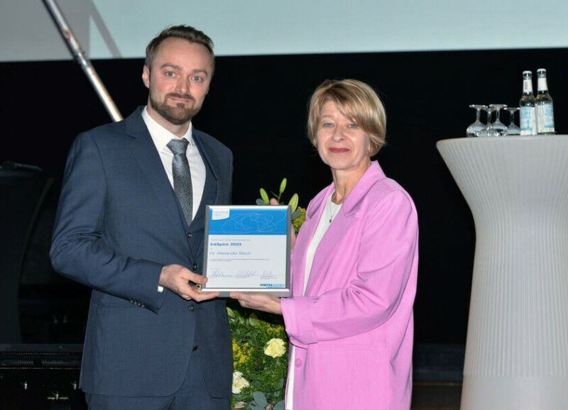 Ute Habel, Prorektorin für Internationales, Überreicht Alexander Birich die Auszeichnung IntSpire, mit der die RWTH dessen Beitrag zur Internationalisierung der Hochschule würdigt.