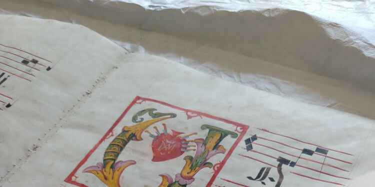 Erstmals zu bewundern sind zwei Neuzugänge, die das Bibelmuseum erst vor kurzem erhalten hat. Ein sogenanntes ,,Antiphonar", eine Notensammlung von liturgischen Gesängen, bietet auf großen Blättern genug Platz für kunstvolle Initialen, darunter eine Darstellung der ,,Sieben Schmerzen Marias". Ebenfalls katholischen Ursprungs ist ein ,,Chrismatorium", ein Gefäß, in dem die heiligen Öle und Zubehör für das Abendmahl wie Hostien aufbewahrt werden konnten. Das Exemplar in der Ausstellung ist aufwändig vergoldet und versilbert - und in einem Bucheinband verborgen. Ergänzt wird es von einem zweibändigen ,,Missale", das unter anderem die Liturgie der Heiligen Messe enthält.
