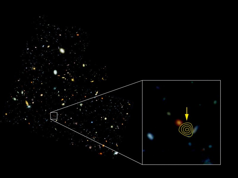 Die Galaxie HDF850.1 erscheint so, wie sie vor 12,5 Milliarden Jahren ausgesehen hat - In der Durchmusterung des Weltraumteleskops Hubble ist HDF850.1 unsichtbar. Aus anderen Beobachtungen wussten die Astronomen jedoch, dass sich hinter dem Objekt eine der produktivsten Galaxien des Alls verbirgt - ein Milchstraßensystem mit der extrem hohen Sternengeburtsrate von 1000 Sonnen pro Jahr. Nun hat ein Team um Fabian Walter vom Heidelberger Max-Planck-Institut für Astronomie erstmals die Entfernung zu der Galaxie bestimmt: Das Licht, das uns heute von ihr erreicht, ging auf die Reise, als der Kosmos nur zehn Prozent seines jetzigen Alters hatte, also vor ungefähr 12,5 Milliarden Jahren. HDF850.1 dürfte zudem Teil eines Haufens aus Protogalaxien sein, der weniger als eine Milliarde Jahre nach dem Urknall entstand. Die Galaxie HDF850.1 ist unter Astronomen bekannt für die enorme Mengen neuer Sterne, die sie produziert - jährlich werden dort Sterne mit einer Gesamtmasse von 1000 Sonnen geboren. In normalen Galaxien wie unserer Milchstraße entsteht gerade mal ein Tausendstel dieser Menge. Doch trotz dieses hervorstechenden Merkmals war HD850.1 in einer Hinsicht nur schwer zu fassen: Die Astronomen hatten jahrzehntelang große Schwierigkeiten, den Abstand der Galaxie von der Erde zu bestimmen.