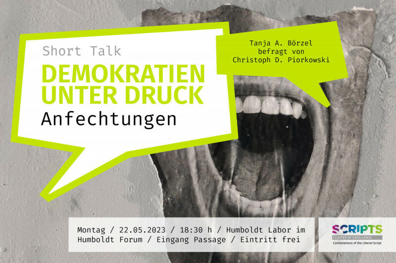 Neuer Short Talk mit Tanja A. Börzel in der Reihe ,,Demokratien unter Druck" des Exzellenzclusters SCRIPTS am 22. Mai 2023 um 18. Uhr im Humboldt Forum. Short Talks #Anfechtungen Weltweit geraten Demokratien derzeit unter Druck - von innen wie von außen. Die Anfechtungen politischer und gesellschaftlicher Ordnungen sind zahlreich: Wie sind die zentralen Herausforderungen miteinander verbunden? Sind wir Zeugen eines besonderen historischen Moments oder musste die Demokratie schon immer gegen äußere und innere Feinde verteidigt werden? Welchen Beitrag kann die Wissenschaft leisten, um das Gefahrenpotenzial zu bestimmen? Oder steht auch die Wissenschaftsfreiheit selbst ihrerseits zur Disposition? Zu diesen und anderen Fragen gibt die Politologin Tanja A. Börzel im Gespräch mit dem Journalisten Christoph D. Piorkowski Auskunft. Das Gespräch findet am 22. Mai im Humboldt Labor im Humboldt Forum statt und beginnt um 18. Uhr; es ist öffentlich, der Eintritt frei. Die Professorin für Politikwissenschaft und Inhaberin des Lehrstuhls für Europäische Integration am Otto-Suhr-Institut für Politikwissenschaft der Freien Universität Berlin forscht unter anderem zu institutionellem Wandel, vergleichendem Regionalismus und Governance.