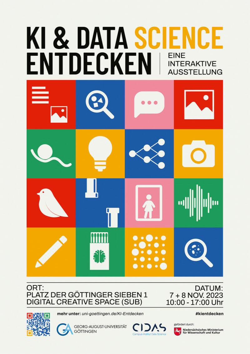 Ausstellung Plakat Präsentation mit interaktiven Experimenten und Vorträgen am 7. und 8. November 2023 Künstliche Intelligenz verändert unsere Art zu arbeiten, zu lernen und zu kommunizieren. Doch was steckt hinter den Technologien dieses Wandels? Das Campus-Institut Data Science (CIDAS) der Universität Göttingen lädt Interessierte ein, am 7. und 8. November 2023 in die spannende Welt von Algorithmen und Datenverarbeitung einzutauchen. Die Ausstellung -KI & Data Science Erleben- vermittelt Wissen und bietet die Gelegenheit, Modelle und Verfahren selbst zu erkunden. Die Präsentation im Digital Creative Space in der Niedersächsischen Staatsund Universitätsbibliothek Göttingen, Platz der Göttinger Sieben 1, ist an beiden Tagen jeweils von 10 bis 17 Uhr geöffnet. Anhand zahlreicher interaktiver Experimente können Besucherinnen und Besucher verstehen, wie KI funktioniert - vom Algorithmus, der Linien in Satellitenbildern erkennt, bis zu einem Computer aus 300 Streichholzschachteln, der eigenständig lernt. Dabei wird ein Einblick in die Mechanismen und Prozesse hinter den Kulissen gewährt und die Funktionsweisen werden erklärt. Begleitend zur Ausstellung lädt das CIDAS Interessierte zu zwei Vorträgen ein.