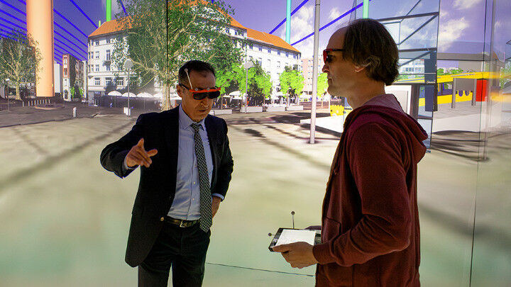 Die letzte Station auf dem Rundgang durch das HLRS war die CAVE, eine Einrichtung für virtuelle Realität. In der CAVE werden Daten in interaktive, immersive Visualisierungen umgewandelt, anhand derer sich komplexe Systeme besser verstehen und diskutieren lassen. Wissenschaftler:innen, Ingenieur:innen und Behörden untersuchen gemeinsam mit der Visualisierungsabteilung des HLRS unter anderem den Klimawandel, entwerfen und optimieren Hightech-Produkte oder erforschen Szenarien für die Stadtplanung mithilfe digitaler Zwillinge. Während des Besuchs zeigte das Visualisierungsteam den Gästen einige aktuelle Anwendungen aus der Industrie sowie einen digitalen Zwilling von Stuttgart, in dem die Ursachen und Ausbreitung von Luftverschmutzung in der Stadt interaktiv dargestellt werden.