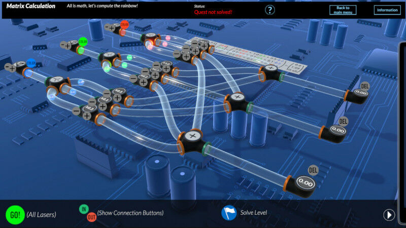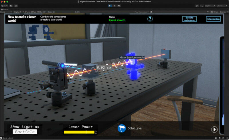 Die Spielerinnen und Spieler lösen in vier aufeinander aufbauenden Leveln verschiedene Aufgaben. Im ersten Level geht es darum, einen Laser zu konstruieren und dabei grundlegende Bauteile und ihre physikalischen Eigenschaften kennenzulernen. In Level zwei soll ein photonischer, also auf der Nutzung von Licht basierender Prozessor konstruiert werden. Dabei wird Wissen über den Datentransfer und optisches Rechnen vermittelt. Level drei vertieft den Stoff durch den Aufbau eines Rechenschemas zur Verarbeitung von Daten. Lernziel ist die Matrizenmultiplikation, die eine Grundlage von Algorithmen zur Lösung komplexer Probleme ist. In Level vier soll eine KI trainiert werden, die runde Formen erkennt.