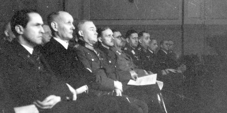 Ehrenpromotion der Philosophischen Fakultät von Gerhard Domagk (2.v.l.) am 30. Januar 1945 im Kurhaus in Bad Salzuflen. Wegen der Bombardierungen in Münster waren Teile der Universität nach Bad Salzuflen ausgelagert.