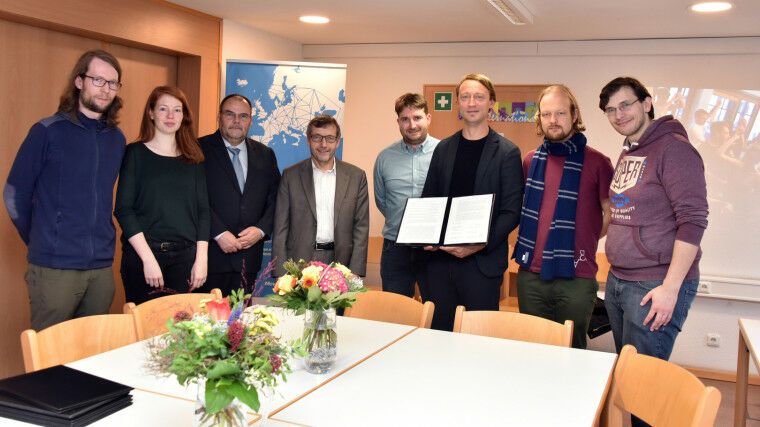 Verlängerung der Kooperation zum Haus auf der Mauer Zehn Jahre nach der Gründung des ,,Internationalen Centrums - Haus auf der Mauer" in Jena erneuerten die Friedrich-Schiller-Universität, die Ernst-Abbe-Hochschule und die Stadt am 8. November ihre Kooperation zur Unterstützung der Begegnungsstätte. Unterzeichner waren Uni-Präsident Walter Rosenthal, der Rektor der Ernst-Abbe-Hochschule Steffen Teichert sowie Dezernent Denis Peisker in Vertretung des Oberbürgermeisters, Sebastian Hollnack für das Studierendenwerk Thüringen sowie die Vorstände der Studierendenräte. Außerdem waren Vertreter der im Zentrum aktiven Studierendenverbände und der Koordinator des Hauses vor Ort. Mit dieser bereits zweiten Folgevereinbarung sichern die Partner dem ,,Haus auf der Mauer" ihre weitere Förderung zu. Die Zusammenarbeit der letzten Jahre blickt auf beachtliche Erfolge: Die Zahl der internationalen Studierenden in der Stadt hat sich seit dem Jahr 2013 fast verdoppelt, die Zahl der Veranstaltungen im ,,Haus auf der Mauer" annähernd verdreifacht. Das Haus mit seinem mittelalterlichen Ambiente im Zentrum Jenas ist heute der wichtigste interkulturelle Begegnungsort für Studierende und aus dem Leben in der Stadt kaum noch wegzudenken. Hier finden regelmäßig Veranstaltungen, Länderabende, Konzerte, aber auch wissenschaftliche Tagungen und Willkommenstage für neue Studierende statt.
