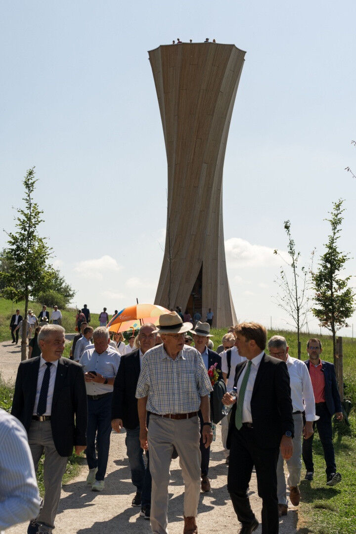 Der Hybrid-Flachs Pavillon zeigt erstmals eine Holz-Naturfaser-Hybridkonstruktion als Alternative zu konventionellen Bauweisen. Für diesen innovativen Ansatz wurde der Pavillon gerade erst für den nominiert. Der 23 Meter hohe Wangen Turm ist der weltweit erste begehbare Aussichtsturm, der gekrümmte großformatige Bauteile verwendet, die sich durch das Schwinden des Holzes selbsttätig formen. Ministerpräsident Kretschmann, der die 113 Stufen zur Aussichtsplattform des Wangen Turms hinaufstieg, zeigte sich nicht nur vom Alpenpanorama beeindruckt, sondern auch von der Entstehungsgeschichte des Turms: Sowohl der Wangen Turm wie auch der Hybrid-Flachs Pavillon wurden nach neuesten Erkenntnissen der Digitalisierungsund Leichtbauforschung geplant und konnten dadurch in kürzester Zeit fertiggestellt werden.