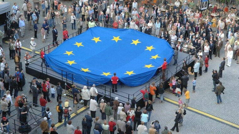 Die Europa-Fahne auf dem Jenaer Markt. Foto: Jürgen Scheere (Universität Jena)