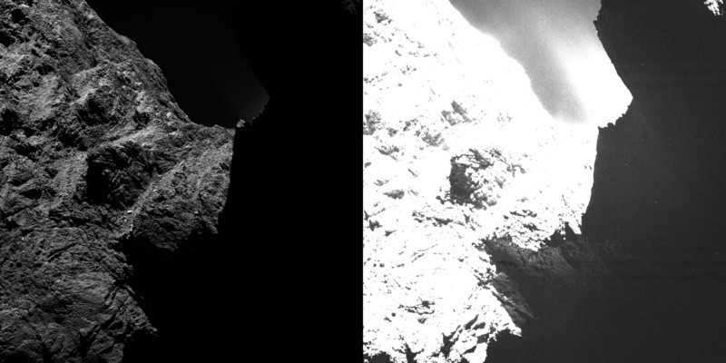Raumsonde Rosetta liefert im Streulicht einen ersten Blick auf die Nachtregion von 67P/Churyumov-Gerasimenko Seit Monaten schon liegt die Südseite des Kometen 67P/Churyumov-Gerasimenko in ewiger Dunkelheit. Strukturen oder auch nur grobe Formen sind dort unmöglich zu erkennen. Lediglich das Streulicht von Staubpartikeln in der Umgebung des Kometen lässt einige Oberflächenmerkmale erahnen. Und in diesem Licht hat OSIRIS, das Kamerasystem an Bord der ESA-Raumsonde Rosetta , jetzt einen ersten Blick auf den Kern geworfen. Ewige Nacht: Ein Bild des Kometen 67P/Churyumov-Gerasimenko, welches das Kamerasystem OSIRIS am 30. Oktober 2014 aus einer Entfernung von etwa 30 Kilometern aufgenommen hat, ist hier in zwei verschiedenen Sättigungsstufen dargestellt. In der linken Aufnahme liegt die rechte Hälfte im Dunkeln; Strukturen lassen sich dort nicht erkennen. In der rechten Aufnahme werden an derselben Stelle Strukturen sichtbar.