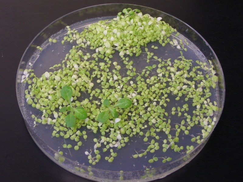 Evolution im Zeitraffer. Das Springen eines Gens aus dem Chloroplastengenom in das Kerngenom wird hier durch die Entstehung einer Antibiotikaresistenz sichtbar gemacht. In den beiden grünen Keimlingen ist das Resistenzgen in den Zellkern eingewandert, wo es korrekt abgelesen werden kann und somit das Wachstum auf antibiotikahaltigem Medium ermöglich. [weniger]