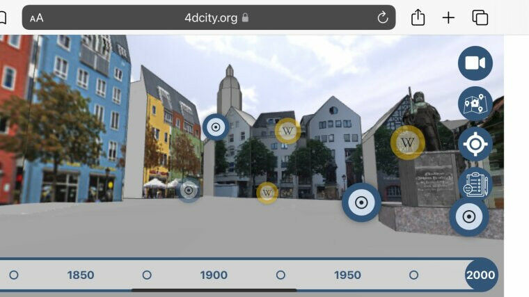 Blick auf den Jenaer Marktplatz im Jahr 2000, wie er im Projekt Jena4D dargestellt wird. Abbildung: Juniorprofessur Digital Humanities; mit Foto von Sander Münster - Das Projekt Jena4D ermöglicht Zeitreisen in die Jenaer Stadtgeschichte: Blick auf den Marktplatz im Jahr 1912. Durch die Jenaer Innenstadt spazieren und dabei auf dem Smartphone sehen, wie diese früher aussah? Jena4D macht diese Zeitreise bald möglich. Ein neues Projekt will Bürgerinnen und Bürger für die Stadtgeschichte begeistern und zum Erinnern und Teilen historischer Fotografien einladen. Dabei soll auch eine umfangreiche digitale Wissenssammlung entstehen. In diesem Monat startet das Projekt Jena4D unter der Leitung von Andreas Christoph von der Thüringer Universitätsund Landesbibliothek Jena (ThULB) und Sander Münster von der Juniorprofessur für Digital Humanities der Universität Jena. Wir freuen uns sehr darauf, im Rahmen dieses Projektes und gemeinsam mit den Bürgerinnen und Bürgern der Stadt das historische Jena, seine Geschichte und Geschichten digital sichtbar zu machen ", sagt dazu Prof. Münster.
