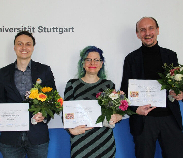 Am 29. Oktober nahmen die drei Preisträger*innen ihren mit jeweils 2.000 Euro dotierten ,, Fü(h)r divers!"- Preis entgegen. ,,Dieser Preis soll Motivation für die Preisträger*innen sein, ihren Weg konsequent weiterzugehen, es lohnt sich in jeder Hinsicht", so Anna Steiger, Kanzlerin der Universität Stuttgart. Es gratulierte auch Prof. Judith Tonhauser, seit Oktober 2024 Prorektorin für den Bereich wissenschaftlicher Nachwuchs und Diversity.
