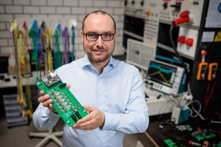 Ein Ansatz zur Minimierung solcher Verluste sind fortschrittliche Topologien wie etwa Partial-Power-Processing (PPP)-Wandler. Das Prinzip hinter diesen Teilleistungs-Wandlern erläutert Stefan Mönch an einem Beispiel aus der Elektromobilität, ein Feld, auf dem er im Rahmen des InnovationsCampus Mobilität der Zukunft (ICM) forscht, was ihm auch den Weg zu seiner Juniorprofessur an der Universität Stuttgart ebnete. ,,Um aus einer Energiequelle mit 400 Volt eine Antriebsbatterie im Elektrofahrzeug mit 350 Volt zu laden, hat man bisher die gesamte Leistung mehrfach und auch galvanisch getrennt gewandelt, das führt zu hohen Verlusten und ist teuer. Beim Partial Power Processing dagegen werden im Beispiel 350 Volt direkt zur Verfügung gestellt und nur die Differenz von 50 Volt, also nur ein Achtel, durch die Leistungselektronik gewandelt, das ist wesentlich effizienter." Einen ähnlichen Ansatz verfolgen Multilevel-Wandler, die auf unterschiedlichen Spannungsniveaus ansetzen und in der Industrie derzeit ein aufkommendes Thema sind.