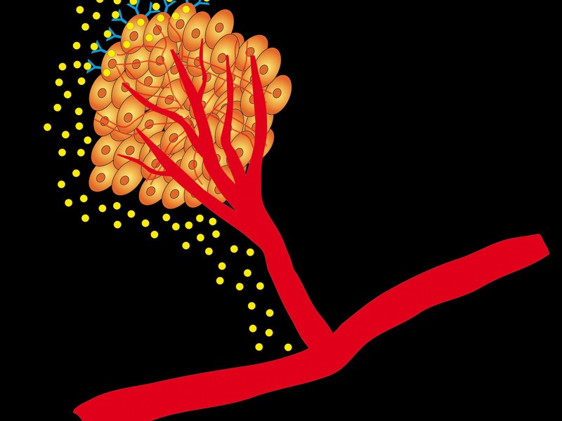 Die Rückkoplungschleife des Tumors: Die Krebszellen schütten das Hormon VEGF (gelb)aus um Blutgefäße in der Nähe (rot) zur Ausbildung kleiner Fortsätze in den Krebs hinein zu stimulieren. Gleichzeitig bilden sie außerdem VEGF-Rezeptoren-2 (blau) aus, an denen sich das VEGF bindet. Dadurch werden die Krebszellen angeregt noch mehr VEGF zu bilden. [weniger]