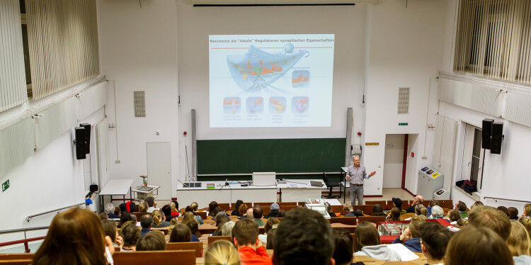 Hörsaal während einer Vorlesung von hinten (oben ) fotografiert, mit Blick auf die Hinterköpfe der Zuhörerinnen und Zuhörer und auf eine Projektion oberhalb der Tafel hinter dem Rednerpult. Neben dem Pult steht ein Dozent und trägt vor; die Projektion zeigt eine grafische Darstellung von regulatorischen Proteinen im Nervensystem. An der Universität Münster erforschen Wissenschaftlerinnen und Wissenschaftler aus der Biologie, Chemie und Medizin sowie dem Max-Planck-Institut für Biomedizin im Sonderforschungsbereich (SFB) ,,Dynamische zelluläre Grenzflächen" Fragen der Biomedizin. Um die öffentlichkeit an den Erkenntnissen teilhaben zu lassen, bietet der SFB Vorträge zu ausgewählten Themen der aktuellen biologischen und biomedizinischen Forschung an. Neben Schülerinnen und Schülern sind alle Interessierten willkommen. Den Auftakt macht am 15. September Mario Schelhaas mit dem Vortrag ,,Eine Lernkurve von der Impfung gegen Pocken bis zu Krebs: Was wir über Effizienz, Chancen und Risiken gelernt haben". Die Veranstaltung beginnt um 19.15 Uhr im Hörsaal des Gebäudes Röntgenstraße 16. Um eine Anmeldung wird gebeten. Weitere Informationen gibt es unter https://www.uni-muenster.de/SFB1348/en/public/.