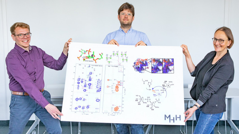 Timm Fiebig, Johannes Cramer und PD Martina Mühlenhoff mit einer Darstellung der chemischen Veränderung der Kapselpolysaccharide des Meningitis-Bakteriums. Copyright: ,,Karin Kaiser / MHH’.