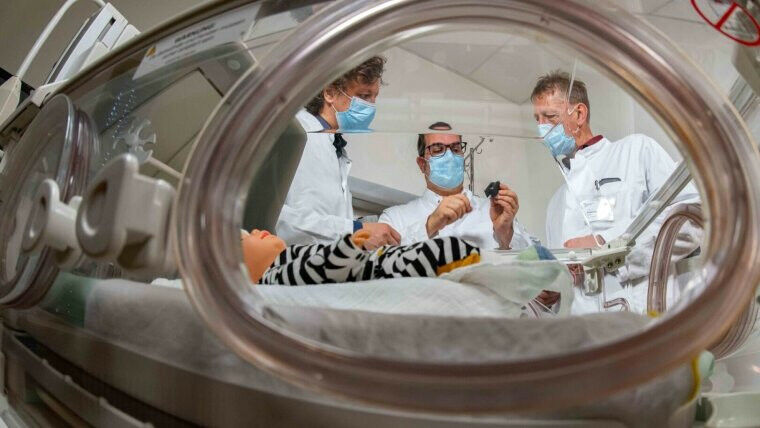 Die Projektleiter Iwan Schie, Patrick Bräutigam und Hans Proquitté (v. l.) hinter einem Inkubator. Foto: Jens Meyer (Universität Jena) - In Deutschland müssen Ärztinnen und Ärzte bei etwa 200 von 800 sehr unreifen Frühgeborenen jährlich - meist wegen einer Infektion - die Nahrung durch einen künstlichen Darmausgang ausund an anderer Stelle wieder zurückleiten, um den Darm zu entlasten. Aktuell funktioniert das nur manuell, was keine kontinuierliche Überführung garantiert, sehr pflegeintensiv ist und die Entwicklung der Babys beeinträchtigt. Ein interdisziplinäres Team von Friedrich-Schiller-Universität, Universitätsklinikum Jena (UKJ) und koordiniert durch die Ernst-Abbe-Hochschule Jena (EAH) will deshalb nun ein miniaturisiertes Transportsystem mit ultraschallund photonikbasierter Sensorik entwickeln, das die kontinuierliche Überführung und Analytik des ausgeleiteten Darminhalts ermöglicht. Damit wollen die Forschenden erstmals einen geregelten kontinuierlichen externen Transport des Darminhaltes ermöglichen und gleichzeitig dessen Zusammensetzung in Echtzeit erfassen. So entsteht eine völlig neue Datenbasis, die bessere medizinische Behandlungsmöglichkeiten für Frühgeborene zulässt.