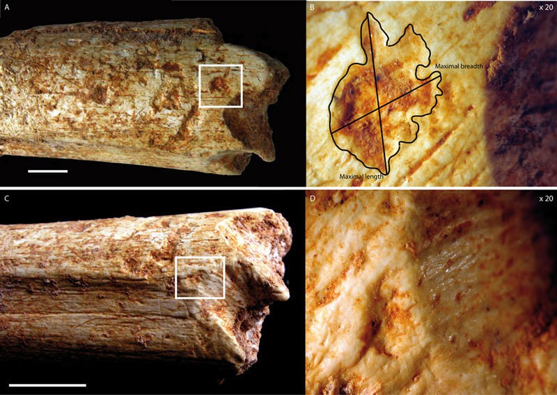 An beiden Enden des Oberschenkelknochens eines 500.000 Jahre alten Homininen aus Marokko befinden sich Beißspuren, die von Fleischfressern stammen, wahrscheinlich von Hyänen. [weniger]