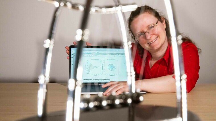 Christin David präsentiert ein Experiment zur Übertragung des mechanischen Impulses. Foto: Jens Meyer (Universität Jena) - Die Physikerin PD Dr. Christin David von der Friedrich-Schiller-Universität Jena erhält in diesem Jahr ein Fellowship im Rahmen des Programms ,,Fellowships für Innovationen in der digitalen Hochschullehre". Vergeben werden diese Stipendien vom Thüringer Wissenschaftsministerium gemeinsam mit dem Stifterverband. In den 15 Monaten Laufzeit möchte Christin David illustrative numerische Experimente entwickeln. Ihre Adressaten sind Studienanfänger in den MINT-Fächern, insbesondere Lehramts-Studierende. Mathematik durchdringt alle Teildisziplinen  . Gemeinsam mit ihren Mitstreitern erstellt Christin David virtuelle Versuchsaufbauten, die reale Phänomene abbilden.