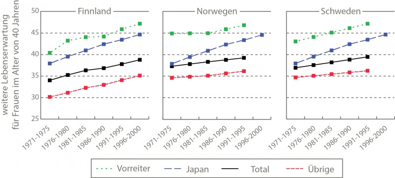Die Ungleichheiten bei der Lebenserwartung verschiedener Bevölkerungsgruppen haben zugenommen. Mit 40 Jahren stehen Finnen, Schweden und Norweger ungefähr in der Mitte ihres Lebens. Ob dann im Schnitt noch einmal etwas weniger oder mehr als 40 Jahre hinzukommen, hängt bekanntermaßen vom Geschlecht der Person ab. Fast genauso entscheidend aber ist, ob die Person zur so genannten ,,Avantgarde" gehört: Ist sie verheiratet und gut gebildet, lebt sie im Schnitt gut fünf Jahre länger als andere Gleichgeschlechtliche. Die Lebenserwartung der verheirateten und gut gebildeten Frauen in Finnland, Norwegen und Schweden ist höher als die der japanischen Frauen, die im internationalen Vergleich vorn liegen. Quelle: Human Mortality Database, eigene Berechnungen nach unveröffentlichten Daten von Statistics Finland, Statistics Sweden, Statistics Norway. Wie es dazu kommt und ob diese Vorreiter der übrigen Bevölkerung den Weg zu einer höheren Lebenserwartung weisen können, untersuchten Domantas Jasilionis vom Max-Planck-Institut für demografische Forschung in Rostock und weitere Kollegen in einer Studie, die im Fachmagazin ,,Population" veröffentlicht wurde.