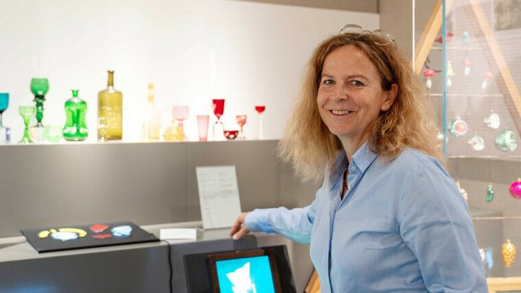 Kunsthistorikerin Juliane von Fircks in der neuen Glas-Ausstellung. Foto: Nicole Nerger/Universität Jena