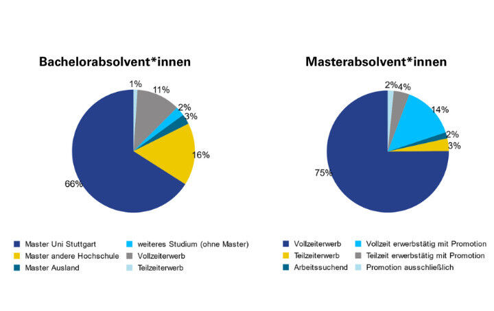 Aus den Ergebnissen geht hervor, dass sich, ein Großteil der Bachelor-Absolvent*innen für ein anschließendes Masterstudium entscheidet - ein Trend, der sich auch in den letzten Jahren beobachten ließ. 66 Prozent der Befragten verbleiben für ihr Masterstudium an der Universität Stuttgart, während 16 Prozent ein Studium an einer anderen Hochschule aufnehmen. Nur etwa 12 Prozent der Bachelor-Absolvent*innen steigen direkt in den Beruf ein. Für die meisten Studierenden der Universität Stuttgart ist der Master der angestrebte Regelabschluss.