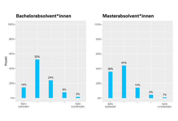 Zwei Drittel der befragten Bachelor-Absolvent*innen geben an, mit ihrem Studium zufrieden oder sehr zufrieden zu sein. Bei den Master-Absolvent*innen liegt der Anteil der (sehr) Zufriedenen sogar bei 80 Prozent. Die Zahl der sehr unzufriedenen Absolvent*innen fällt sowohl im Bachelorals auch im Masterbereich mit zwei bzw. einem Prozent ausgesprochen gering aus. Mehr als 60 Prozent der Bachelorund nahezu 70 Prozent der Master-Absolvent*innen würden sich erneut für ein Studium an der Universität Stuttgart entscheiden.