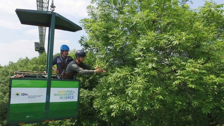 Mit dem Leipziger Auwaldkran erforschen iDiv-Wissenschaftler den verborgenen Lebensraum Baumkrone. Foto: Steffen Schellhorn - Life Veranstaltung - Meldung vom: Das Deutsche Zentrum für integrative Biodiversitätsforschung Halle-Jena-Leipzig (iDiv) feierte heute sein 10-jähriges Bestehen mit einem Festakt im Paulinum der Universität Leipzig. Über 300 Gäste aus Politik, Wissenschaft und Gesellschaft nahmen teil, darunter die Ministerpräsidenten Sachsens, Sachsen-Anhalts und Thüringens, Michael Kretschmer, Dr. Reiner Haseloff und Bodo Ramelow sowie der Beauftragte der Bundesregierung für Ostdeutschland, Staatsminister Carsten Schneider. Sie würdigten die wichtigen Beiträge des Forschungszentrums für den Schutz der biologischen Vielfalt. Bundeskanzler Olaf Scholz betonte in einer Video-Grußbotschaft die Bedeutung der ,,Grundlagenforschung von Weltrang" für die internationale Biodiversitätspolitik. Neben den Wortbeiträgen aus der Politik spielte während der Veranstaltung auch die Biodiversitätsforschung selbst eine wichtige Rolle. Wissenschaftlerinnen und Wissenschaftler präsentierten Highlights der iDiv Externer Link -Forschung samt ihrer Tragweite für die Entwicklung wirksamer Maßnahmen gegen die Biodiversitätskrise.