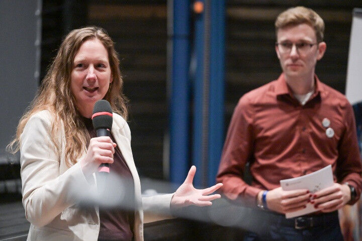Judith Tonhauser, Prorektorin für wissenschaftlichen Nachwuchs und Diversity der Universität Stuttgart, lobte das Engagement und unterstrich die strategische Bedeutung von Diversität für die Universität Stuttgart. Sie betonte in ihrem Beitrag, dass Initiativen wie Pride in STEM essenziell für eine moderne und offene Wissenschaftslandschaft seien. ,,SimTech hat eine Vorreiterrolle, da passieren so viele wunderbare Dinge, die als Vorbild dienen können für die gesamte Universität und die eine Strahlkraft in die Universität haben", so Judith Tonhauser. Mit Witz, Leichtigkeit und großer Empathie schaffte Moderator*in Janboris Ann-Kathrin Rätz einen Safe Space, in dem eine offene Diskussion zustande kam.
