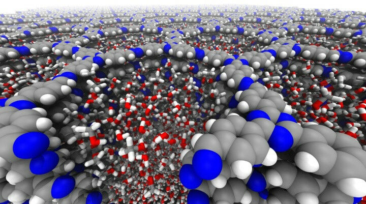 Molekulardynamische Simulation eines kovalenten, organischen Netzwerks (COF). COFs sind eine von vier Materialklassen, die in der zweiten Förderperiode weiterentwickelt werden, um Poreneffekte in der Katalyse zu untersuchen. Foto: SFB 1333 Forschende wollen katalytische Reaktionen gezielter steuern und setzen auf mesoporöse Materialien ,,Molekulare heterogene Katalyse in definierten dirigierenden Geometrien" (SFB 1333) an der Universität Stuttgart erhält eine zweite Förderperiode und damit Fördermittel in Höhe von knapp 12 Millionen Euro. Dies entschied der Senat der Deutschen Forschungsgemeinschaft (DFG) in seiner Sitzung am 24. und 25. Mai 2022. Der SFB vernetzt 19 Forschungsgruppen der Universität Stuttgart mit Partner*innen am Max Planck Institut für Festkörperforschung in Stuttgart sowie an den Universitäten Paderborn, Marburg und Bochum. Sprecher des SFBs ist Prof. Michael Buchmeiser vom Institut für Polymerchemie der Universität Stuttgart. Katalytische Reaktionen machen rund 80 Prozent aller Synthesen in der chemischen und pharmazeutischen Industrie aus.