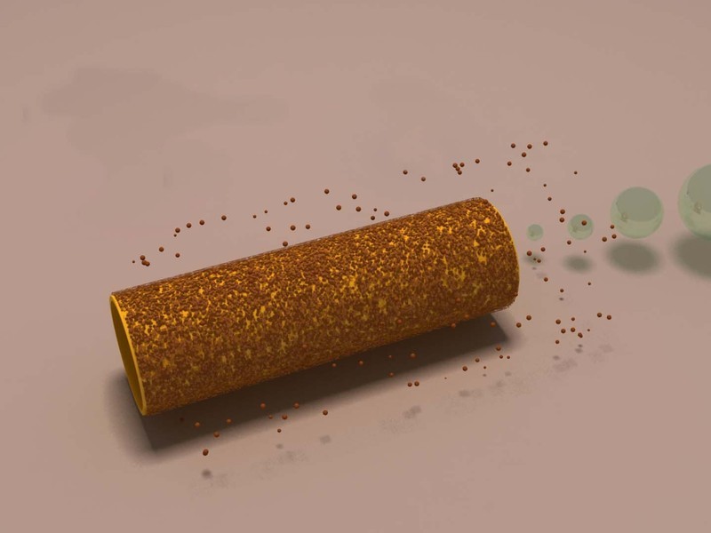 Mikroröhrchen für die Abwasserreinigung: Die etwa 500 Mikrometer langen Röhrchen bestehen aus einer äußeren Eisen- und einer inneren Platinschicht. An der Eisenschicht zersetzt Wasserstoffperoxid, das dem Wasser zugesetzt wurde, organische Schadstoffe zu Kohlendioxid und Wasser. An der inneren Platinschicht zerfällt Wasserstoffperoxid in Sauerstoff und Wasser. So wird das Röhrchen zum Düsentriebwerk: Die aus dem Röhrchen strömenden Sauerstoffblasen schieben es in eine Richtung. Die schwimmenden Kläranlagen reinigen Wasser etwa zwölf mal schneller als Eisenröhrchen ohne den Antrieb. [weniger]