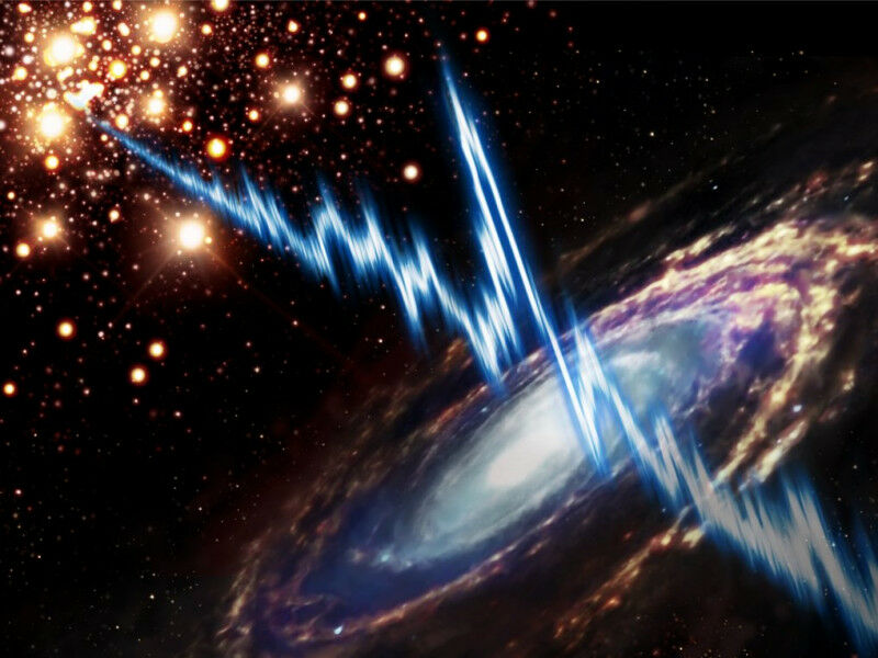 Blitz im All: Die künstlerische Darstellung zeigt den Ausbruch von Radiostrahlung, wie er in einem Kugelsternhaufen der Spiralgalaxie Messier 81 beobachtet wird. Daniëlle Futselaar/ASTRON (artsource.nl) - Forschende orten die Quelle in einem Kugelsternhaufen der Galaxie M 81 Sie zählen zu den großen Rätseln des Weltalls: Strahlungsausbrüche, die ungefähr eine Tausendstelsekunde dauern und nur in Radioteleskopen erscheinen. Seit ihrer Entdeckung im Jahr 2007 forschen die Astronominnen und Astronomen nach der Ursache dieser kosmischen Blitze. Nun hat ein Team unter Beteiligung des Max-Planck-Instituts für Radioastronomie und seiner 100-Meter-Antenne in Effelsberg einen dieser schnellen Radiobursts (FRB) im bisher geringsten Abstand von der Erde gefunden, in der rund 12 Millionen Lichtjahre entfernten Spiralgalaxie Messier 81. Mehr noch: Die Quelle sitzt offenbar in einem Kugelsternhaufen dieser Galaxie - dort, wo man einen FRB am wenigsten erwartet hätte. Die meisten der schnellen Radioblitze tauchen wie aus dem Nichts auf, einige wenige wiederholen sich periodisch. Jeder dieser Ausbrüche sendet so viel Energie aus, wie die Sonne an einem ganzen Tag abstrahlt.