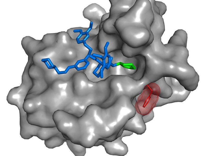 Der SAFit-Ligand (blau und grün) ist ein hoch selektiver Hemmstoff von FKBP51 (grau), einem Risikofaktor für stressbedingte psychiatrische Erkrankungen. Durch die Anlagerung von SAFit ändert sich die Ausrichtung einer Seitenkette des FKBP51 Proteins (rot). Dies ist bei dem sehr ähnlichen funktionalen Gegenspieler FKBP52 nicht möglich. [weniger]