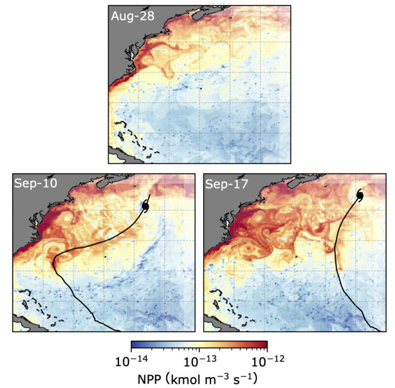 Ein weiterer auffälliger Effekt der Hurrikane sie, dass sie eine Durchmischung der oberen Wasserschicht bewirken, wodurch Nährstoffe an die Oberfläche gelangen. In der Simulation der Hurrikane im September 2020 verzehnfachte sich daraufhin das Wachstum von Phytoplankton, das der Atmosphäre ebenfalls Kohlendioxid entzieht. Die Blüte hielt nach dem Durchzug der Hurrikane noch einige Wochen an und beschränkte sich nicht nur auf deren Zugbahn: Lokale Strömungen, die teilweise durch die Stürme verstärkt wurden, verteilten die Biomasse über weite Teile des westlichen Nordatlantiks.