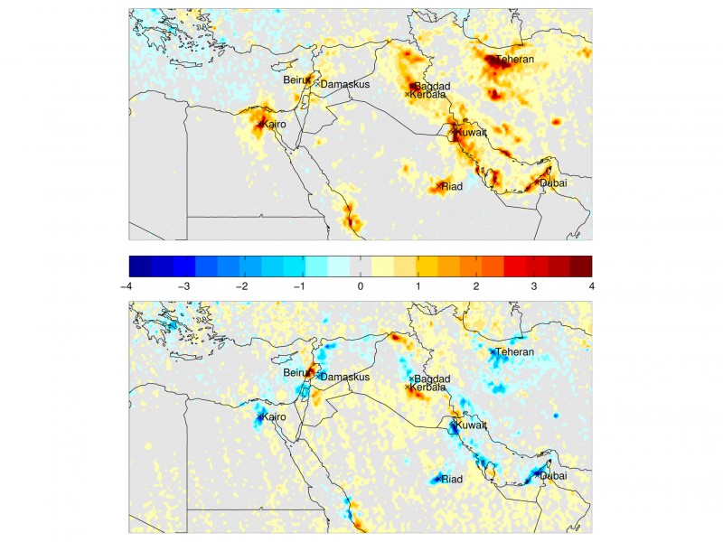 Während die Stickstoffdioxidemissionen von 2005 bis 2010 fast im ganzen Nahen Osten stiegen (obere Karte), sind sie zwischen 2010 und 2014 in vielen Regionen gesunken (untere Karte). Die Farben stehen für die Änderungen der Konzentration an Stickstoffdioxid in 1015 Molekülen pro Kubikmetern Luft während des betrachteten Zeitraums. [weniger]