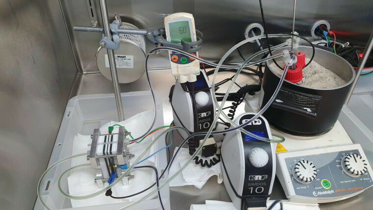 Testaufbau im CEEC Jena, um neuartige Aktivmaterialien für Redox-Flow-Batterien zu entwickeln. Foto: Philipp Borchers/Uni Jena