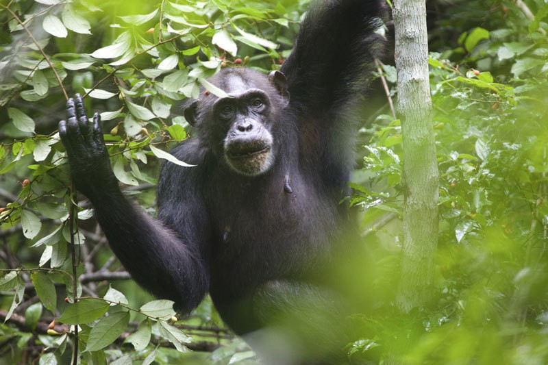Für Schimpansen ist es schwierig, sich mit energiereichen Nahrungsmitteln wie tropischen Früchten zu versorgen. In unseren Supermärkten kaufen wir Himbeeren im Winter und Esskastanien im Sommer. Wie wäre es aber, wenn wir uns vor allem von Obst ernähren würden und dieses von heimischen Bäumen selbst pflücken müssten? Eine größtenteils pflanzliche Ernährung, ein einfacher Magen und ein relativ großes Gehirn, das extra Energie verbraucht, stellen Schimpansen bei der täglichen Nahrungssuche vor Herausforderungen. Ein Konsortium von Wissenschaftlern des Leipziger Max-Planck-Instituts für evolutionäre Anthropologie, der Harvard University, der McGill University, der University of St. Andrews und der Université Félix Houphouët Boigny hat in drei Regenwäldern in Ost-, Zentralund Westafrika gesammelte Daten ausgewertet. Mit ihrer Analyse zur monatlichen Verfügbarkeit junger Blätter und unreifer sowie reifer Früchte können sie jetzt abschätzen, wie schwierig es für Schimpansen ist, diese Nahrung zu finden, und vorauszusagen, wo, wann und in welcher Menge sie an einzelnen Bäumen verfügbar ist. Schimpansen können daher verschiedene Strategien einsetzen, um sich den Zugang zu den energiereichsten aber kurzlebigen Nahrungsquellen zu sichern. Weiblicher Schimpanse beim Verzehr von Grewia-Früchten sowie eine Auswahl von Regenwaldfrüchten, die von Schimpansen in Uganda, der Elfenbeinküste und Gabun verspeist werden.