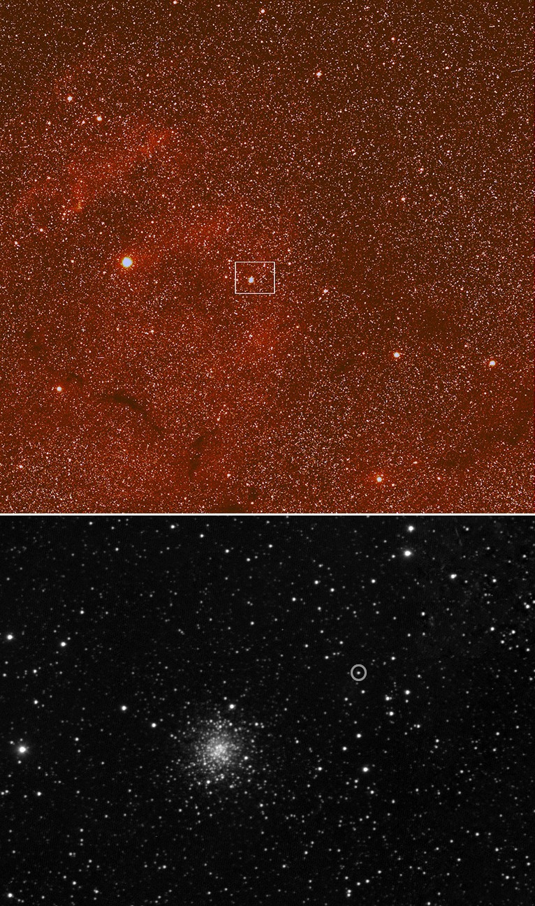 Komet im Visier: Die Bilder zeigen 67P/Churyumov-Gerasimenko im Sternbild Ophiuchus. Das obere Bild, das mit der Weitwinkelkamera (WAC) am 20. März 2014 aufgenommen wurde, bildet einen Bereich ab, der 25-mal so groß ist wie der Durchmesser des Vollmonds. Das Farbkomposit zeigt im Hintergrund kosmisches Wasserstoffgas und Staubwolken. Der weiße Rahmen gibt die Lage der Nahaufnahme an, die mit der Telekamera (NAC) aufgenommen wurde. Unten ein Ausschnitt aus dem NAC-Bild vom 21. März 2014. Der kleine Kreis neben dem hellen Sternhaufen M107 deutet auf den Kometen hin. Die Bilder entstanden aus einer Distanz von etwa fünf Millionen Kilometern, Rosetta befand sich zu diesem Zeitpunkt etwa 660 Millionen Kilometer von der Erde entfernt. [weniger]