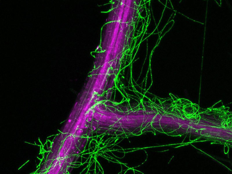 Mikroskopischer Ausschnitt einer Arabidopsis thaliana- Wurzel (violett), die mit Pilzgeflecht von Colletotrichum tofieldiae (grün) umgeben ist. Das Pilzgeflecht befindet sich auch innerhalb der Wurzeln (nicht gezeigt). [weniger]
