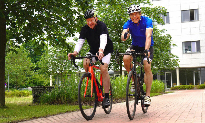 N’Uwe Tegtbur, Direktor des Instituts für Sportmedizin der MHH (links), und Peter Hillemanns, Co-Sprecher des CCC-N (rechts), die seit vielen Jahren gemeinsam Rennrad fahren.