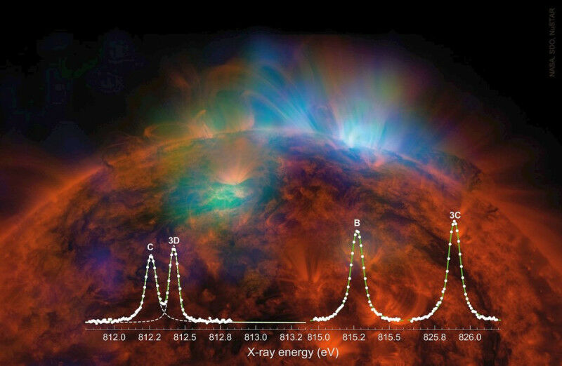 Daten von Weltraumteleskopen lassern sich zukünftig mit hohem Vertrauen in die zugrunde liegenden Atommodelle analysiern. Die Sonne im Blick: Diese Aufnahme ist eine Überlagerung von zwei Bildern, aufgenommen mit dem Nuclear Spectroscopic Telescope im Röntgenbereich Array (NuSTAR, grün und blau) und dem Solar Dynamics Observatory im Ultraviolettbereich (SDO, rötlich). Hier wird Gas mit Temperaturen zwischen einer und drei Millionen Grad sichtbar. In der spektral zerlegten Röntgenstrahlung zeigen sich dominant die Emissionslinien 3C und 3D von Fe XVII sowie B und C von Fe XVI (Fotos: NASA/JPL-Caltech). Sehr heißes Gas, wie es in der Korona der Sonne oder der nahen Umgebung Schwarzer Löcher existiert, sendet intensive Röntgenstrahlung aus. Sie verrät, welche physikalischen Bedingungen, wie Temperatur und Dichte, dort herrschen. Doch seit Jahrzehnten kämpfen die Forschenden mit einem Problem: Die im Labor gemessenen Intensitätsverhältnisse wichtiger Strahlungslinien von Eisen stimmen nicht mit den berechneten Überein, und damit herrscht auch Unklarheit über die aus den Röntgenspektren abgeleiteten Größen des Gases.