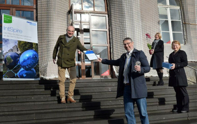 RWTH-Rektor Ulrich Rüdiger Überreichte den Preis ,,IntSpire’ an Bernd Markert, Institut für Allgemeine Mechanik. Ute Habel, Prorektorin für Internationales, und Henriette Finsterbusch, Dezernentin Internationale Hochschulbeziehungen gratulierten