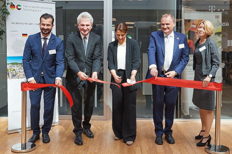 Das obligatorische Band zur Eröffnung wird durchschnitten: (v. l. GEI-Geschäftsführer Anas Aljuaidi, Minister Andreas Pinkwart, Ministerin Mariam bint Mohammed Saeed Hareb Almheiri, GEI-Geschäftsführer Bernhard Randerath und RWTH-Prorektorin Ute Habel - Die RWTH Aachen siedelt zur Förderung des wissenschaftlichen und wirtschaftlichen Austausches zwischen den Vereinigten Arabischen Emiraten (VAE) und der Bundesrepublik Deutschland das neue German-Emirati-Institute in Deutschland an. Die Kooperation geht auf einen Austausch der Bundeskanzlerin Angela Merkel mit Kronprinz HH Mohamed bin Zayed Al Nahyan im Jahr 2019 zurück, bei dem Technologiezusammenarbeit insbesondere mit Blick auf Industrie 4.0 vereinbart wurde. Das neue Institut, welches als Projektträger agieren wird, heißt dementsprechend mit vollem Namen ,,German-Emirati Institute - Technologies 4.0" (GEI) und hat seinen Sitz auf dem RWTH Aachen Campus. ,,Das GEI zeigt, dass die RWTH international als erstklassige Partnerin für die Entwicklung neuer Technologien wahrgenommen wird, dass wir gerne in weltweiten Netzwerken und ohne kulturelle Hürden Spitzenforschung betreiben", erläutert Profes-sorin Ute Habel, Prorektorin für Internationales. Insgesamt wurden über 25 Projektvorhaben identifiziert, in denen die VAE und Deutschland zusammen Industrie 4.0-Projekte aufbauen und entwickeln können. Fördergelder erhalten bereits vier Projekte im Bereich Emissionsfreie Synthetische Kraftstoffe, Intelligente Kabine für Flugzeuge, Recycling von Flugzeugteilen und verbesserte Cockpits für Flugzeuge und Autos.
