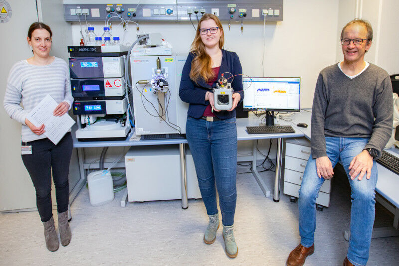 Jasmin Zischke (links) nutzt für ihre Forschung das von Pich (rechts) geleitete Proteomics-Labor. Doktorandin Theresa Schweitzer (Mitte) zeigt einen Aufsatz des neuen Massenspektrometers.