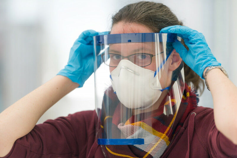 Solidarität der Universität Stuttgart mit medizinischem Personal im Kampf gegen Corona-Infektionen: Wissenschaftlerinnen und Wissenschaftler am Forschungscampus ARENA2036 stellen mit Unterstützung von Industriepartnern Schutzvisiere statt Autoteile her.