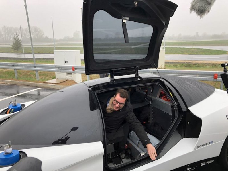 Minister Hendrik Wüst testet auf der Testrecke des Aldenhoven Testing Center das ika-Forschungsfahrzeug SpeedE.